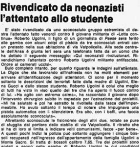 «Come con Valerio». Così Rina Carla Zappelli, la madre di Valerio Verbano, nel suo libro titola il capitolo dedicato al misterioso agguato ai danni di Roberto Ugolini, l’ex militante di Lotta Continua che nella mattina del 30 marzo 1979 viene gambizzato da tre giovani a volto scoperto sulla soglia della sua abitazione. In «Sia folgorante la fine», scritto e pubblicato nel 2010 con il giornalista Alessandro Capponi, Carla Verbano mette in parallelo la vicenda Ugolini con l’omicidio di suo figlio. Effettivamente sono tanti gli elementi in comune: i due agguati, avvenuti in meno di un anno di distanza, hanno luogo praticamente nella stessa zona, l’area che separa il «rosso» quartiere di Monte Sacro dal «nero» quartiere Trieste Salario; in entrambi i casi tre giovani agiscono presso l’abitazione del loro bersaglio; le due vittime appartengono all’area della sinistra extraparlamentare; stando alle rivendicazioni che seguono i due attentati, la matrice è chiaramente di tipo neofascista.