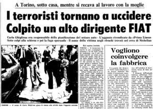Ore 9:20. Una voce femminile rivendica l’omicidio ai telefoni della redazione torinese dell’Ansa: «Qui Prima Linea – gruppo di fuoco di Charlie e Carla, rivendichiamo l’eliminazione dell’ing. Ghiglieno Carlo, dirigente FIAT del processo logistico. Perché non vi sbagliate l’abbiamo eliminato con sette colpi calibro.38 Special Norma a punta cava. Questo è il primo atto della campagna di terrore proletario verso il comando d’impresa. Qui Prima linea in onore ai compagni Matteo e Barbara».