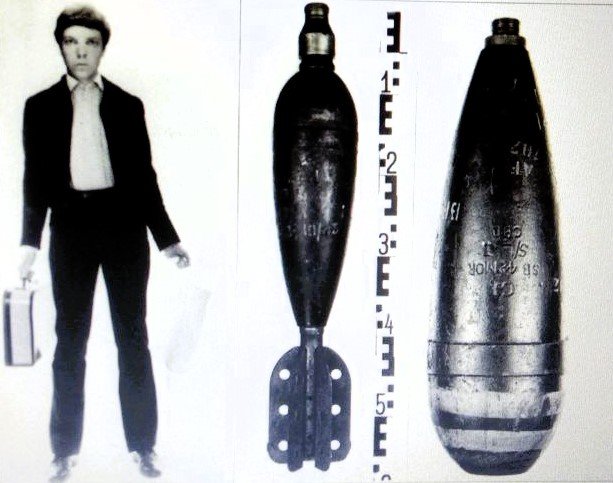 Identikit dell’attentatore e della granata di mortaio usata per confezionare l’ordigno diffuso dalla polizia nei giorni seguenti alla strage: la valigia bianca trasportata da Köhler insieme alla busta che conteneva la bomba, notata da vari testimoni, non fu mai ritrovata