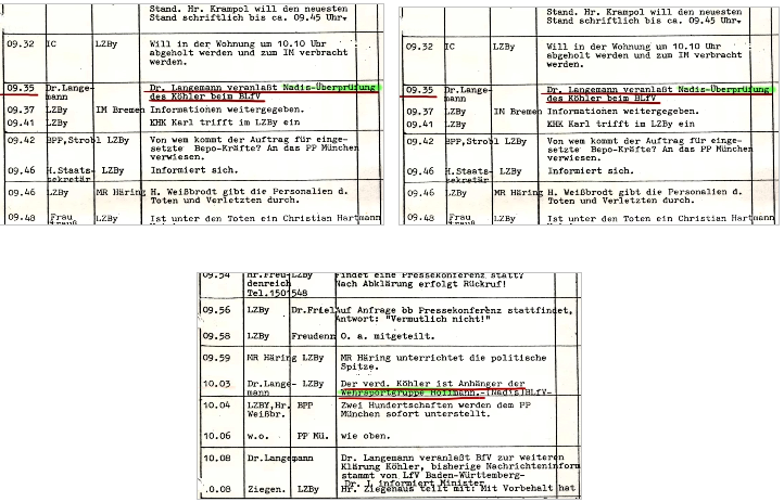 Era questa la prova che Langemann aveva riferito in tempo reale a due giornalisti di sua conoscenza, Heigl e Paul Limbach, entrambi firme degli scoop pubblicati dal popolare settimanale Quick, interna sullo stato delle indagini, a cominciare dall’identità del presunto attentatore Gundolf Köhler, quando il nome non era ancora stato reso noto dalla Procura generale. Alle 9.35 di sabato 27 settembre 1980, appena ricevuta la segnalazione dai dirigenti del LKA, Langemann aveva richiesto verifica del nominativo nel cervellone elettronico NADIS, la banca dati condivisa dei servizi segreti e di tutti gli organi di sicurezza nazionale della Repubblica federale, scoprendo che Köhler risultava collegato alla nota organizzazione paramilitare neonazista Wehrsportgruppe Hoffmann, informazione da lui prontamente girata alla stampa, violando il riserbo imposto dal procuratore Rebmann.