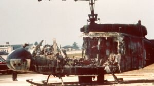 I resti di uno degli elicotteri sui quali i terroristi palestinesi tentarono di partire, con gli ostaggi israeliani, dalla base aerea di Fürstenfeldbruck. Il blitz della polizia tedesca provocherà un massacro