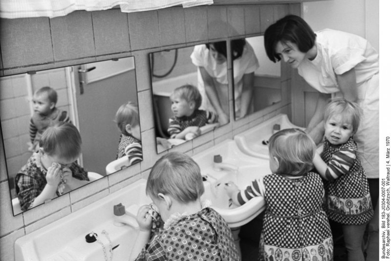 In altri paesi socialisti come la Cecoslovacchia, con un sistema organizzativo dell’educazione della prima infanzia molto simile a quello della DDR, furono effettuati studi sugli effetti dell’educazione collettivista sui bambini più piccoli, questi rivelarono come la separazione precoce dai genitori, specialmente dalla madre, fosse causa di forte deprivazione emotiva, che si manifestava in età adulta in una serie di sintomi, trasmessi anche da una generazione alla successiva: paura dell’abbandono, del rifiuto e del giudizio, vuoto interiore, bassa autostima, sfiducia nelle proprie emozioni, ansia sociale, difficoltà nelle relazioni sentimentali. Questi risultati, discussi anche pubblicamente, convinsero il regime di Praga a operare correttivi, si procedette persino a una forte riduzione dei posti nido, sostenendo le famiglie in altro modo. Nella DDR, invece, esattamente nello stesso periodo, il ministero della Salute pubblica, insieme all’Istituto per l’Igiene infantile e adolescenziale, sviluppò un sistema per verificare dettagliatamente il successo del processo di crescita e apprendimento del bambino sulla base di moduli e piani educativi prefissati. Le critiche di specialisti ed educatori al carattere rigidamente normativo di questi ultimi, che non tenevano sufficientemente conto delle caratteristiche individuali dei bambini furono sostanzialmente ignorate. Da contro, ne risultò ulteriormente potenziata la concezione del bambino come materia da modellare, oggetto di un’azione educativa volta a renderlo capace di prestazioni fisiche e psichiche oggettivamente misurabili e verificabili.