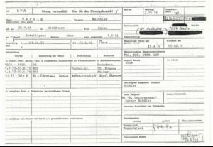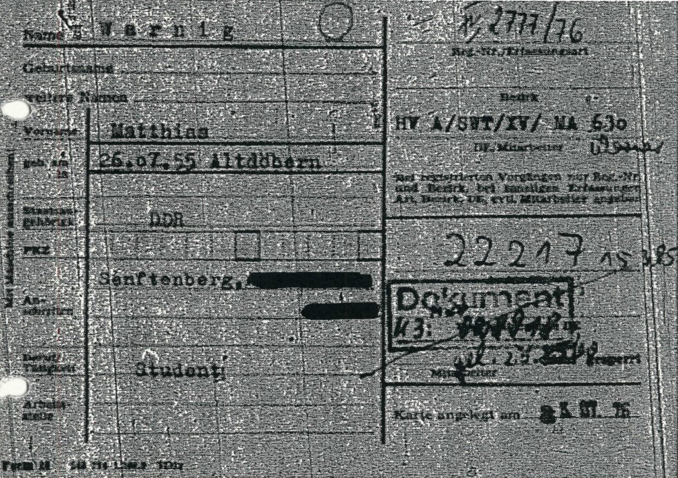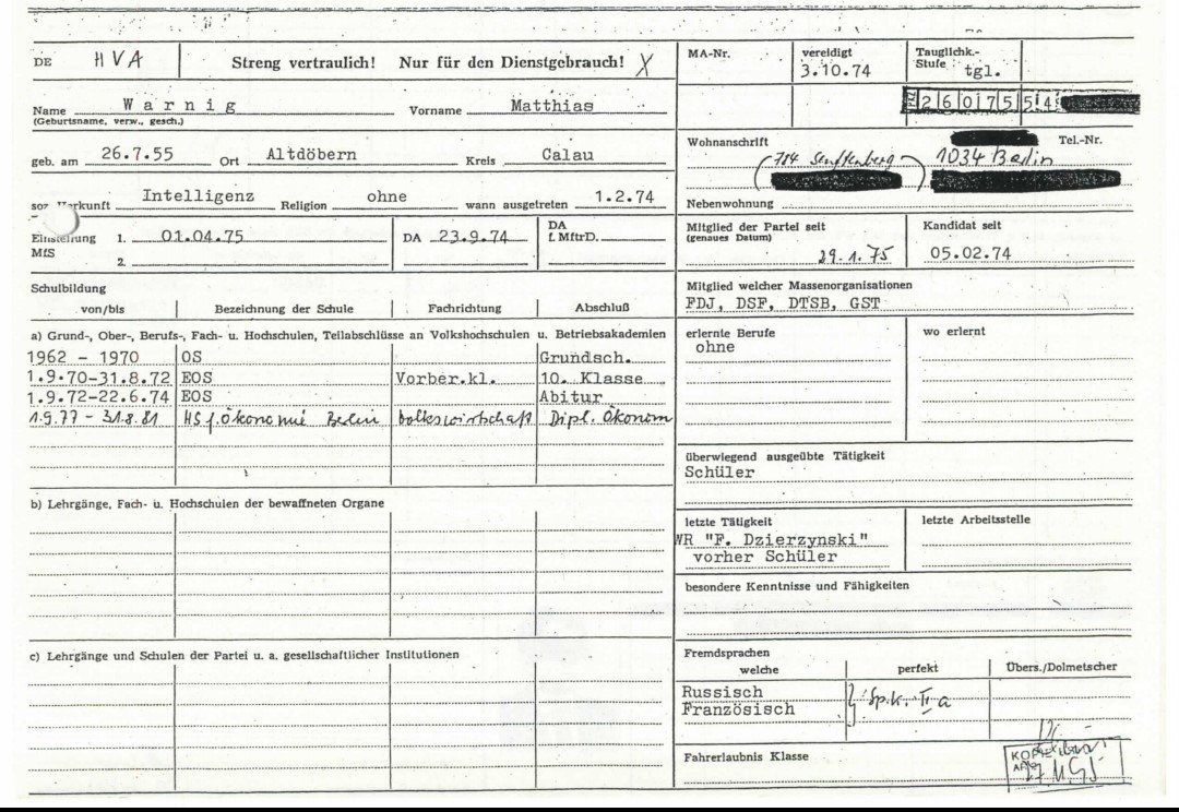 La scheda di Warnig ai tempi degli studi presso la Hochschule für Ökonomie; da qui il nome in codice “Ökonom” assegnatogli dall’HV A. Il documento, con nominativo coperto, proviene dagli schedari operativi della XII Divisione centrale (gestione dati e archivi)