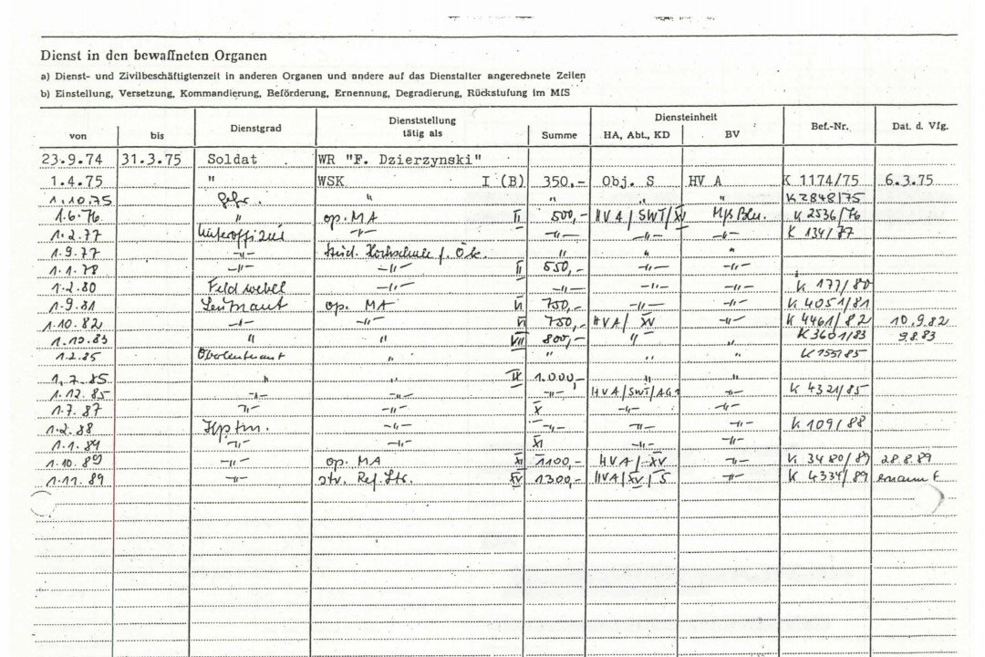 La scheda con i dati relativi alla carriera di Warnig (fascicolo personale, archivio dei collaboratori/quadri)