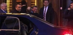 San Pietroburgo, aprile 2014: l’arrivo di Putin in occasione del compleanno dell’ex cancelliere tedesco Schröder. Warnig è il primo da sinistra