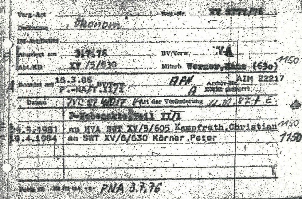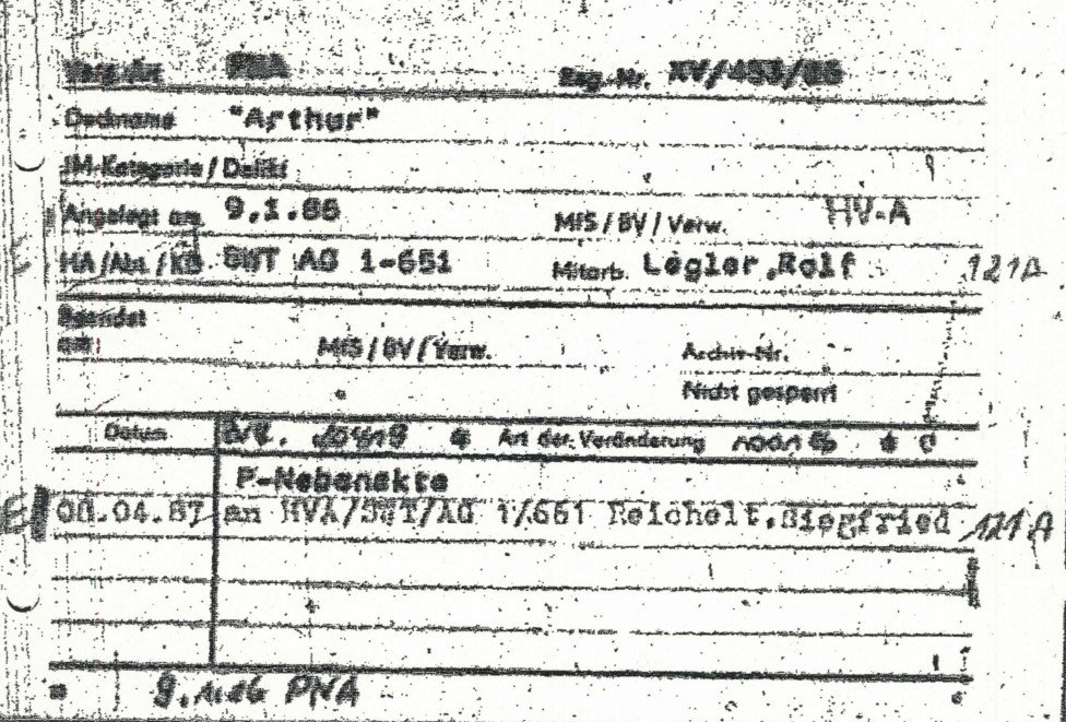 La scheda di “Arthur”, altro alias di Warnig, relativa agli anni 1986-88. Il documento, con nominativo coperto, proviene dagli schedari operativi della XII Divisione centrale (gestione dati e archivi)