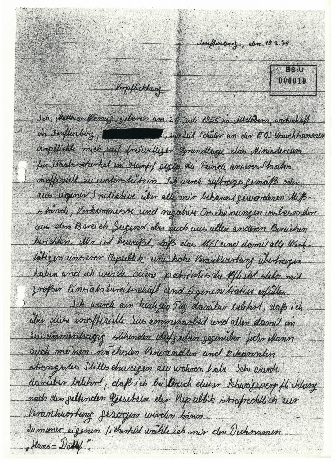 Era uso nella DDR, all’atto dell’arruolamento fiduciario nell’immenso esercito invisibile dei delatori, fare firmare ai nuovi “collaboratori non ufficiali” (inoffizielle Mitarbeiter, breve: IM) un’impegnativa d’ingaggio riservata, scritta di proprio pugno sotto dettatura del funzionario gestore della fonte. In quella di Matthias Warnig si legge: «M’impegno a sostenere la Sicurezza di Stato in via confidenziale nella lotta contro i nemici del nostro Stato». Questi nemici, veri o presunti, Matthias alias IM “Hans-Detlef” (questo il suo primo nome in codice registrato negli archivi della Stasi) si incaricava a cercarli fra i suoi compagni di classe, dentro e fuori l’istituto, diventando così una delle migliaia di spie, diverse centinaia delle quali ancora minorenni (come esplicitamente voluto da Mielke in una direttiva segreta del 1966), che quotidianamente in tutto il Paese del Muro rifornivano la polizia segreta di informazioni dall’interno delle scuole, sulla condotta dei ragazzi, sul rapporto fra genitori e insegnanti e quant’altro poteva essere d’interesse e utilità per riconoscere gli orientamenti anche solo potenziali dei singoli sin dalla primissima adolescenza e prendersi cura sul nascere di ogni “tendenza e manifestazione negativa” si manifestasse nel delicato settore della vita dei giovani, ai quali il regime realsocialista della DDR, come tutte le dittature, dedicava le sue particolari attenzioni.