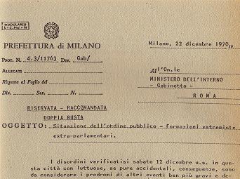 «I disordini verificatisi sabato 12 dicembre u.s. in questa città con luttuose, se pure accidentali, conseguenze, sono da considerare i prodromi di altri eventi ben più gravi e deprecabili che possono ancora verificarsi in conseguenza del progressivo rafforzamento e proliferazione delle formazioni estremistiche extraparlamentari di ispirazione “maoista” (Movimento Studentesco, Lotta Continua, Avanguardia Operaia, ecc.) nonché dei movimenti anarchici e di quelli di estrema destra. Tutti questi movimenti, che hanno la loro “centrale” a Milano, nonostante differenziazioni sul piano ideologico e nella metodologia di intervento, sono prettamente rivoluzionari, propugnano “la lotta al sistema” e si prefiggono di sovvertire le istituzioni democratiche, consacrate dalla Carta Costituzionale, attraverso la violenza organizzata».