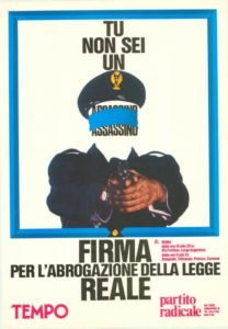 Il manifesto di Piergiorgio Maoloni che vedete a destra è stato realizzato in occasione della campagna di raccolta firme del Partito Radicale per l’abrogazione della Legge Reale. Nel maggio del 1976, poco dopo le prime affissioni, il sostituto procuratore della Repubblica Luigi De Liguori dispone il sequestro delle stampe. Il giorno seguente i radicali sfilano a Milano in un corteo di protesta, indossando «a sandwich» grosse copie dei manifesti e scandendo slogan contro la legge. In piazza Duomo, nel corso della manifestazione, un militante si rivolge così ai giornalisti: «Da quindici anni gridiamo nelle piazze, sui marciapiedi, che i lavoratori in divisa sono compagni sfruttati peggio di noi. La Legge Reale ha cercato di trasformare questi cittadini in divisa in assassini contro i contadini, contro gli operai, contro i braccianti che lottano per l’affermazione dei loro diritti».