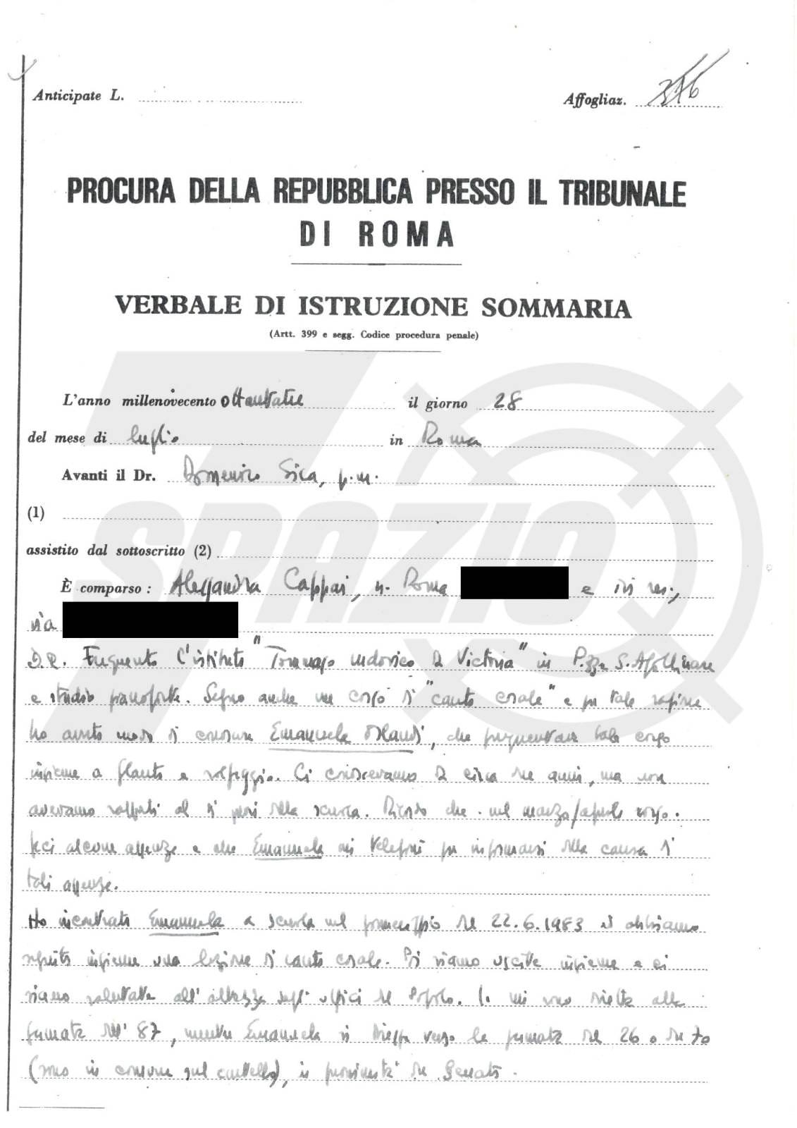 Proprio l’eventuale presenza di una testimone è un particolare ancora più importante nell’economia investigativa della vicenda. Monzi lo confermò anche nella sua seconda deposizione, resa pochi giorni dopo, il 28 luglio, al sostituto procuratore Domenico Sica, fresco titolare delle indagini: “Preciso che la Emanuela mi riferì come l’offerta di lavoro le era stata fatta mentre era in compagnia di un’amica, ma non mi precisò chi fosse”.