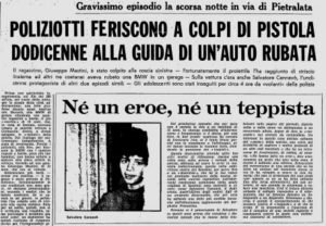 «Un sottoufficiale di polizia», si legge sull’edizione del Corriere della Sera del 13 gennaio 1971, «ha sparato contro un’auto rubata da tre ragazzini e ne ha ferito uno durante la drammatica caccia alla macchina lanciata a tutta velocità (…). Cannavò e il suo amico Luigi Agostini sono stati bloccati mentre il terzo, Giuseppe Mastini, riusciva a far perdere le tracce. Solo questa mattina è stato rintracciato in un accampamento di zingari, accampati alla periferia della città. Il ragazzo ha una ferita a una gamba, che era stata medicata alla meglio. Il colpo esploso dal sottoufficiale lo aveva raggiunto, fortunatamente, senza conseguenze troppo gravi».