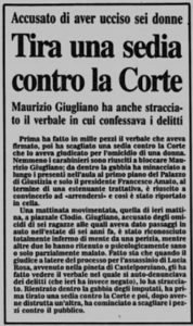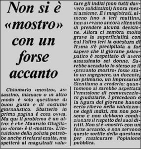«Chiamarlo mostro, assassino, maniaco o in altro modo, è solo questione di buon gusto e di costume giornalistico. Sbatterlo in prima pagina è cosa ovvia. Ma qui il problema è un altro: è che Maurizio Giugliano “forse” è il mostro (…). Ci sembra molto grave la superficialità con cui l’altro ieri la questura di Roma s’è precipitata a far sapere che il giovane psicopatico è sospettato di avere assassinato sei donne. Sarebbe accaduto lo stesso se il presunto mostro fosse stato un ingegnere, un docente, un primario, un impresario? Stentiamo a crederlo».