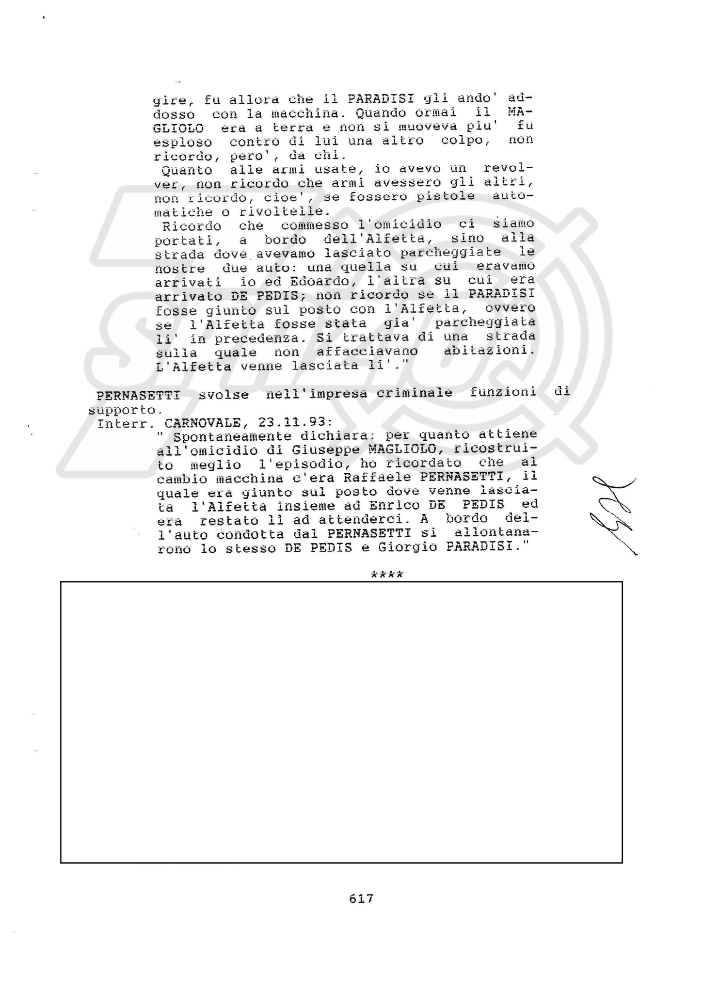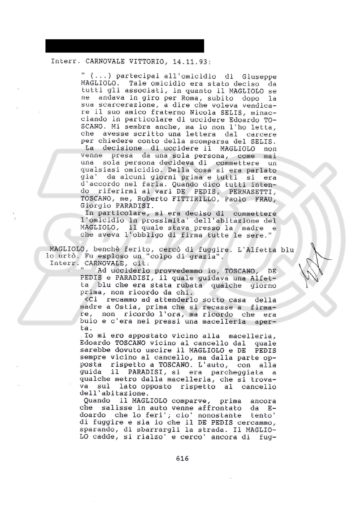 «Mi fu detto da Edoardo Toscano che a commettere l’omicidio furono egli stesso, il Pernasetti e Roberto Fittirillo» raccontò il 18 novembre 1992 Crispino, da molti ritenuto la gola profonda della Banda. Sennonché quel 24 novembre 1981, mentre Magliolo veniva crivellato di colpi, lui era in carcere. Quanto sapeva era quindi un de relato. De visu invece il racconto reso da Carnovale il 16 (e non il 14, come erroneamente riportato nella sentenza di primo grado) novembre 1993: «A ucciderlo, provvedemmo io, Toscano, De Pedis e Paradisi, il quale guidava un’Alfetta blu rubata. […] Ci recammo ad attenderlo sotto casa della madre a Ostia, prima che si recasse a firmare […] Io mi ero appostato vicino alla macelleria, Edoardo Toscano vicino al cancello dal quale sarebbe dovuto uscire il Magliolo e De Pedis sempre vicino al cancello, ma dalla parte opposta rispetto a Toscano […] Quando il Magliolo comparve, prima ancora che salisse in auto venne affrontato da Edoardo che lo ferì; ciò nonostante tentò di fuggire e sia io che il De Pedis cercammo, sparando, di sbarrargli la strada. Il Magliolo cadde, si rialzò e cercò ancora di fuggire. Fu allora che Paradisi gli andò addosso con la macchina. Quando ormai il Magliolo era a terra e non si muoveva più fu esploso contro di lui un altro colpo, ma non so da chi».