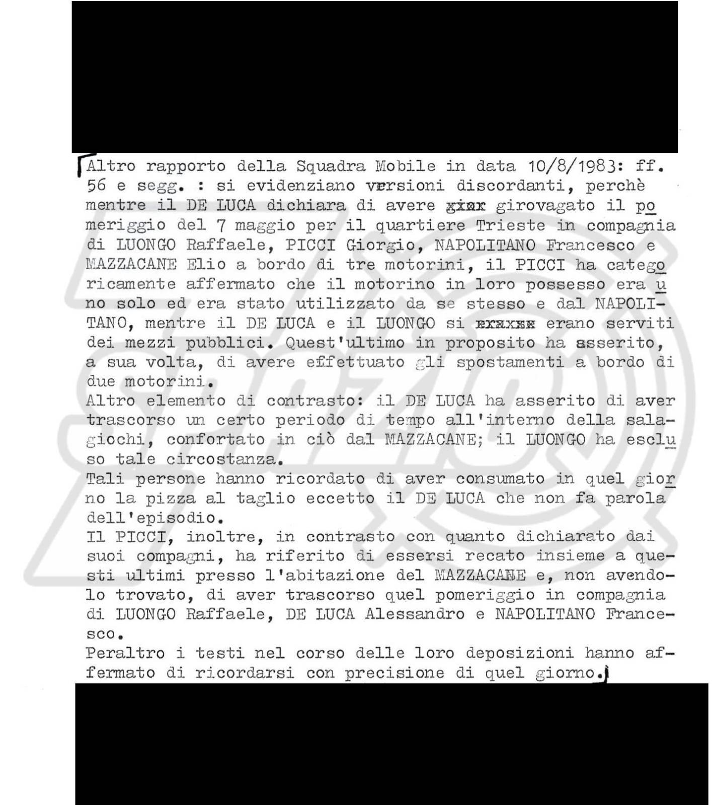 Queste ultime parole sono la chiave per capire il rilievo della Squadra Mobile sulle discordanze di quei ragazzi nei resoconti di quella giornata: «De Luca dichiara di aver girovagato per il quartiere Trieste […] a bordo di tre motorini; Picci ha affermato che il motorino in loro possesso era uno solo ed era stato utilizzato da se stesso e dal Napolitano, mentre il De Luca e il Luongo si erano serviti dei mezzi pubblici. Quest’ultimo in proposito ha asserito di avere effettuato gli spostamenti a bordo di due motorini» […] «De Luca ha asserito di aver trascorso un certo periodo di tempo all’interno della sala giochi, confortato dal Mazzacane; il Luongo ha escluso tale circostanza. Tali persone hanno ricordato di aver consumato la pizza al taglio eccetto il De Luca che non fa parola dell’episodio».