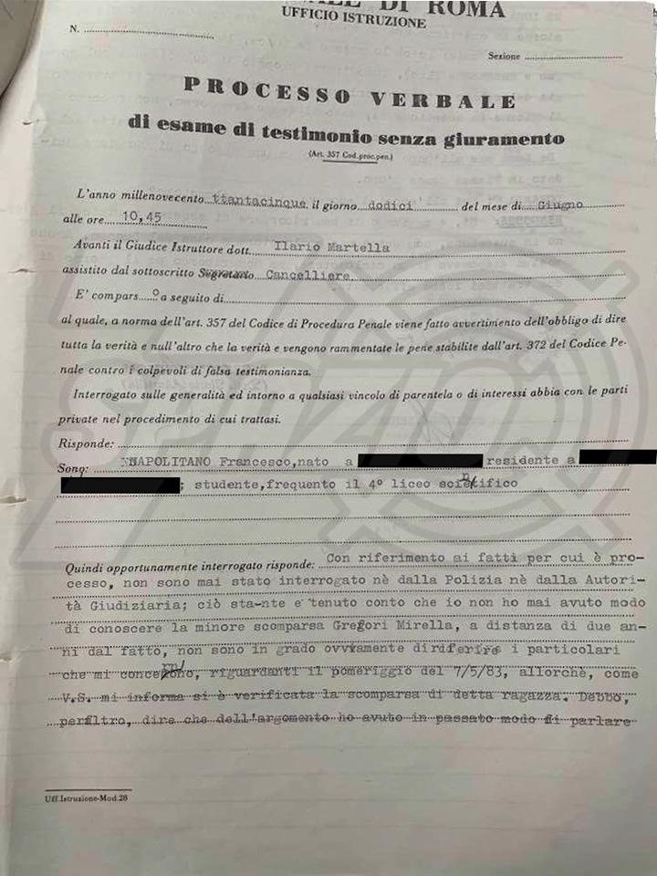 Appunto degli inquirenti sulla scomparsa di Mirella Gregori, 7-5-1983