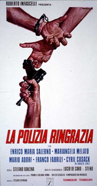 «La polizia ringrazia» di Steno (Stefano Vanzina) è notoriamente considerato il capostipite del poliziesco all’italiana. In realtà il film è più prossimo al thriller-politico di Damiano Damiani ed Elio Petri. La pellicola tradisce un clima di forte tensione sociale, grazie alla fotografia cupa e alla musica di Cipriani che sarà un marchio di fabbrica per i veri, futuri, polizieschi. Ma le differenze non vanno sottovalutate: le superiori capacità di Steno e la violenza che pur essendo notevole non è mai esagerata né fine a sé stessa. La sceneggiatura ben strutturata apre a uno squarcio descrittivo del clima dei primi anni Settanta: a posteriori, può infatti scorgersi benissimo qualcosa di simile a ciò che sarà la Loggia P2, intesa come organizzazione capace di infiltrarsi presso tutti i più importanti gangli dello Stato.